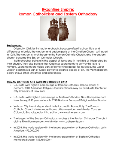 Byzantine Empire Roman Catholicism And Eastern Orthodoxy Worksheet